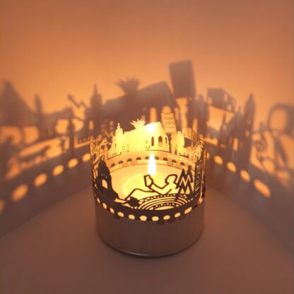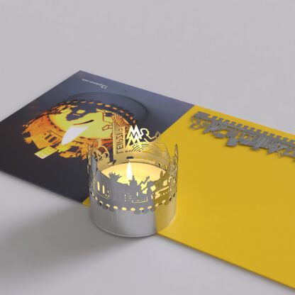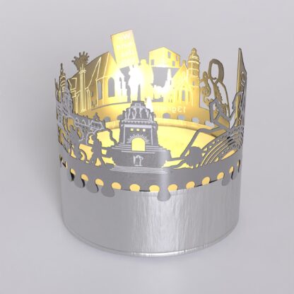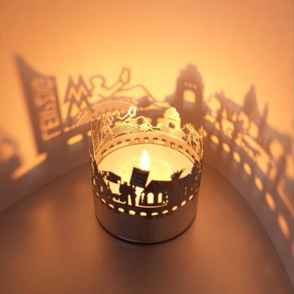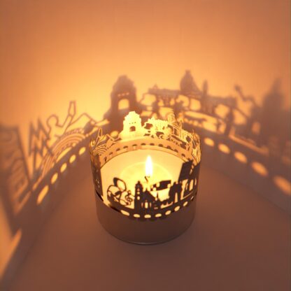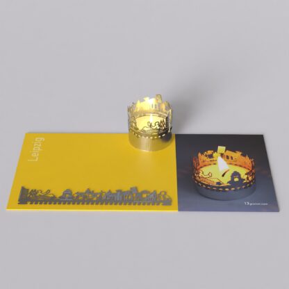The Leipzig souvenir candle attachment shadow play is the perfect gift and souvenir for Leipzig enthusiasts. This unique tea light accessory transforms an ordinary candle into a mesmerizing spectacle of light. With the stainless steel silhouette of Leipzig projecting into the room, the flickering candle brings the city’s charm to life. Truly enchanting!