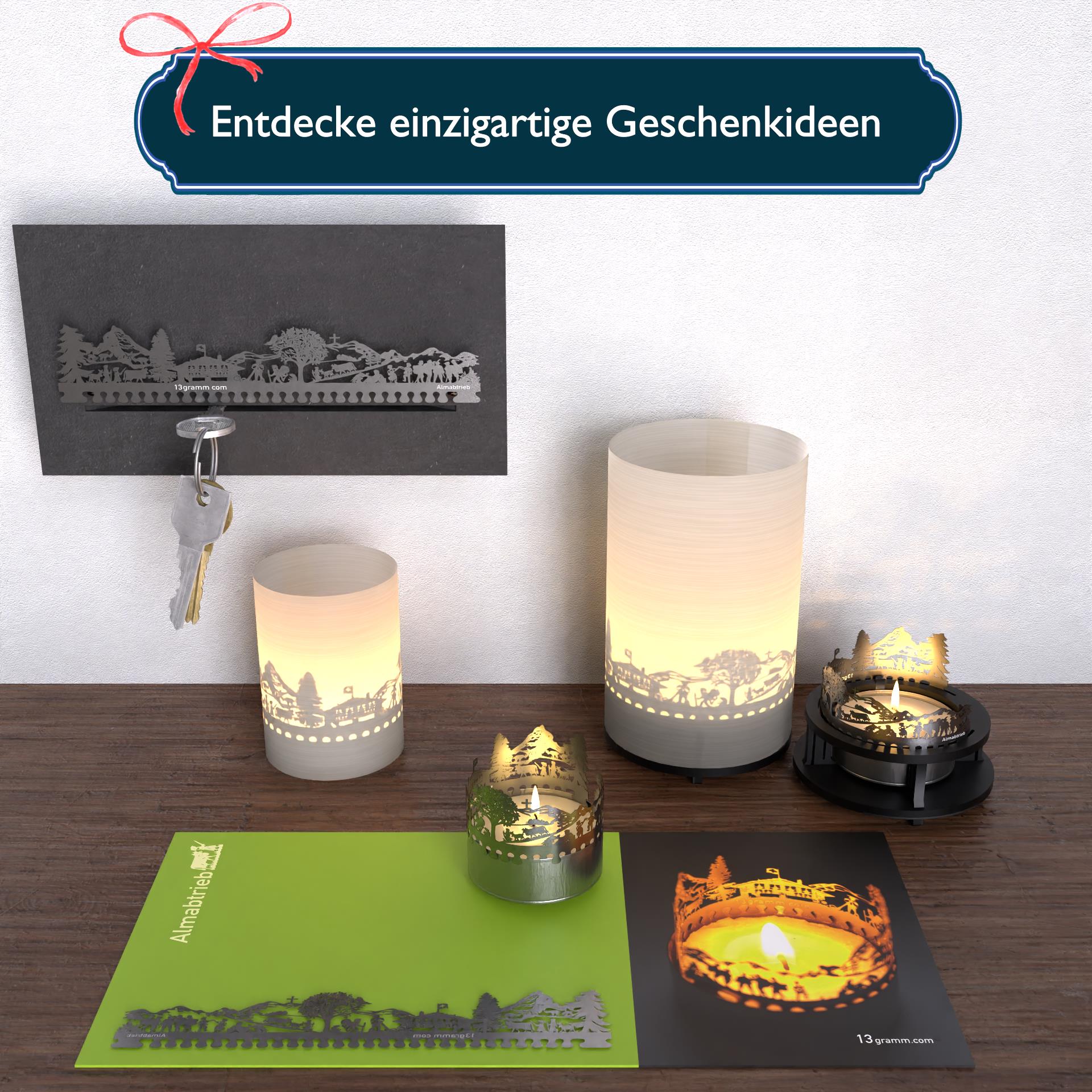 Unser Almabtrieb Windlicht Schattenspiel eignet sich perfekt als Geschenk für alle Alpenliebhaber und Menschen, die gerne eine gemütliche Atmosphäre in ihrem Zuhause schaffen möchten. Verwende es als Mittelpunkt auf deinem Esstisch oder als stilvolle Dekoration in deinem Wohnzimmer. Kombiniere es mit anderen alpenländischen Accessoires und schaffe so eine einzigartige Atmosphäre. Das Almabtrieb Windlicht Schattenspiel ist auch eine wunderbare Geschenkidee für Geburtstage oder Weihnachten.