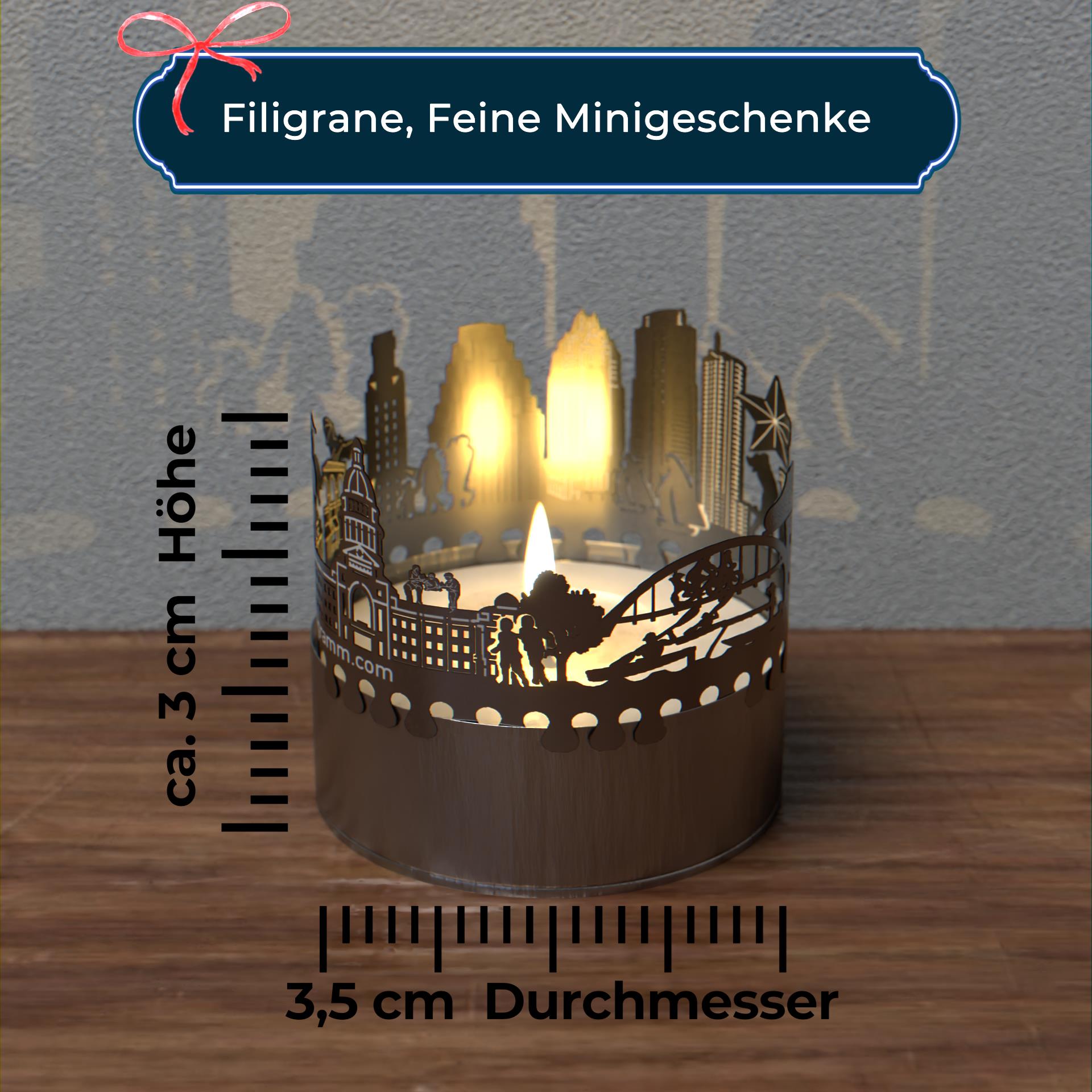 Das Austin Skyline Schattenspiel zaubert das einzigartige Flair der Stadt in Ihr Zuhause. Der Kerzen-Aufsatz verwandelt jedes Teelicht in ein faszinierendes Schauspiel, das durch die Edelstahl-Silhouette der Skyline von Austin erschaffen wird. Lassen Sie die Wahrzeichen wie den Texas State Capitol oder die 360 Bridge aufleuchten und genießen Sie den atemberaubenden Anblick, der Sie in die Stadt der Live-Musik entführt. Ein stilvolles Wohn-Accesoire, das perfekt als Austin Souvenir Geschenk geeignet ist.