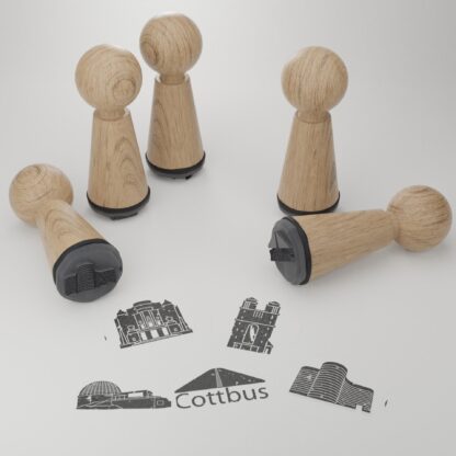 Lieferumfang: Stempelset, bestehend aus 5 verschiedenen Stempeln zum Thema Cottbus. Die Stempel sind aus hochwertigem Buchenholz gefertigt mit einer Höhe von 36mm und einem Durchmesser von 15mm. Das Stempelgummi ist auf einer federnden Schaumstoffschicht montiert.