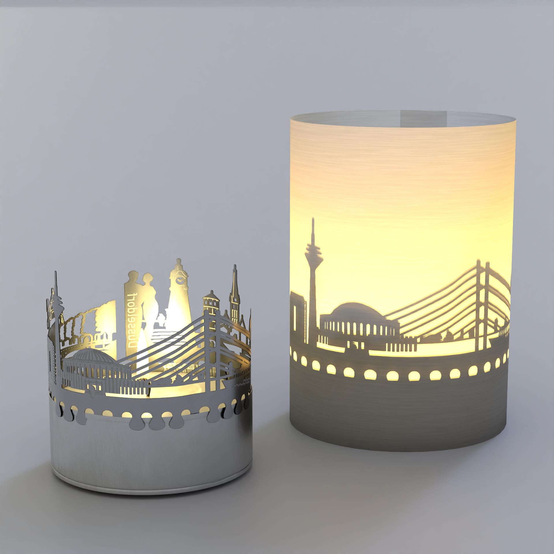 - Filigrane Düsseldorf Silhouette, zusammen mit Teelicht und Projektionsschirm in praktischer Tube-Box – als Souvenir, Andenken oder zum Weiterverschenken ideal geeignet