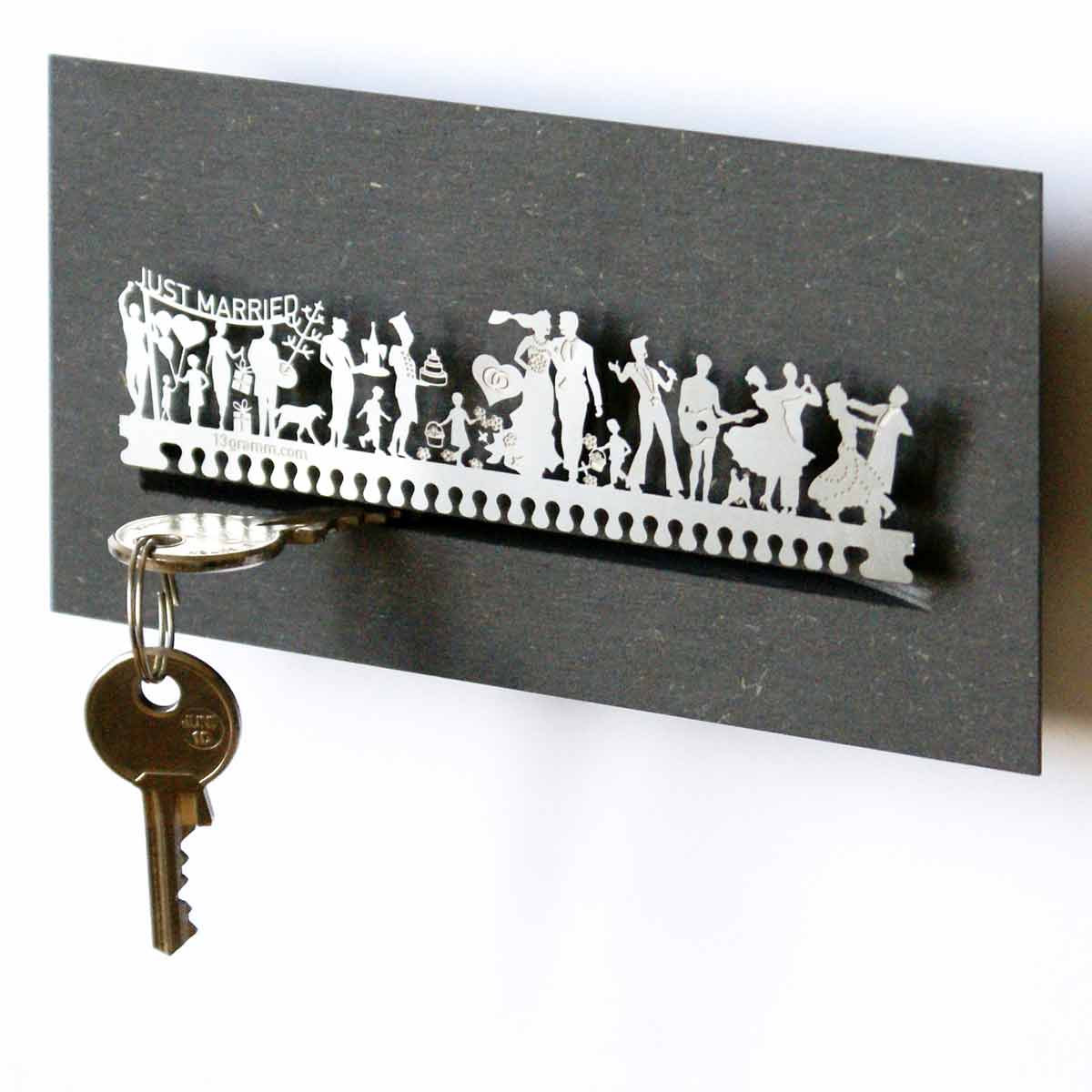 Lieferumfang: Das Schlüsselbrett ist aus Holz gefertigt mit den Maßen 150 x 80 x 30 mm sowie mit tiefem Steckschlitz zum Einstecken der Schlüssel und wird in einem Geschenk-Karton geliefert. Die Hochzeit Silhouette ist aus hoch-vergütetem Federstahl gefertigt und magnetisch wechselbar, und austauschbar mit allen anderen 13gramm-Silhouetten.