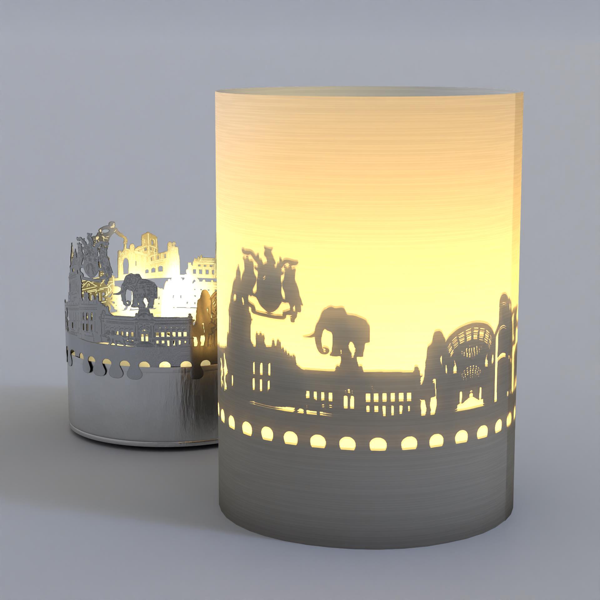 - Filigrane Leeds Silhouette, zusammen mit Teelicht und Projektionsschirm in praktischer Tube-Box – als Souvenir, Andenken oder zum Weiterverschenken ideal geeignet