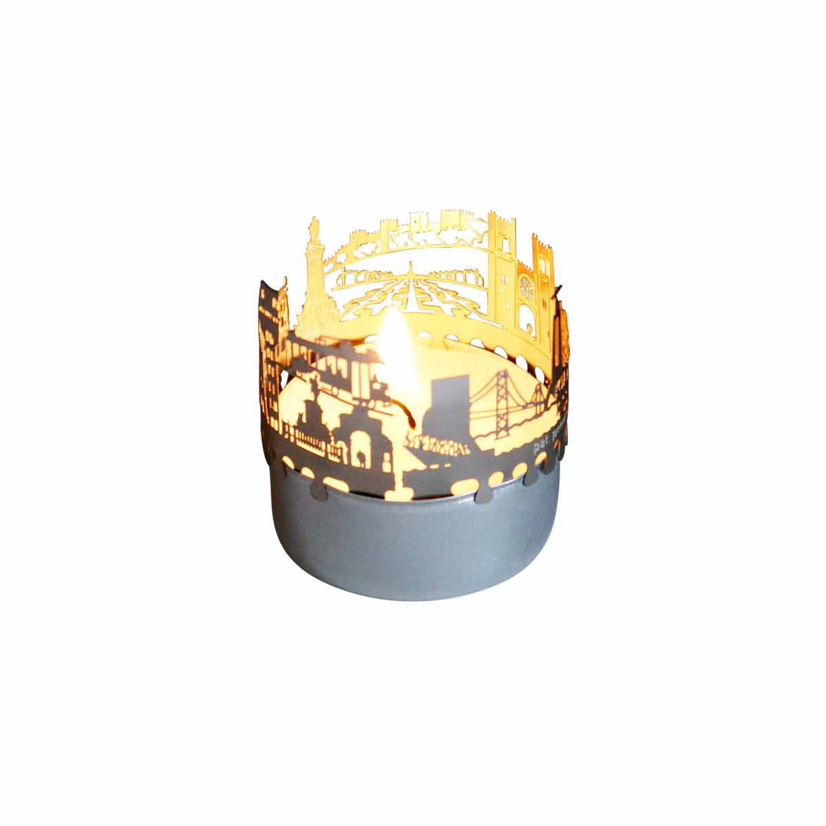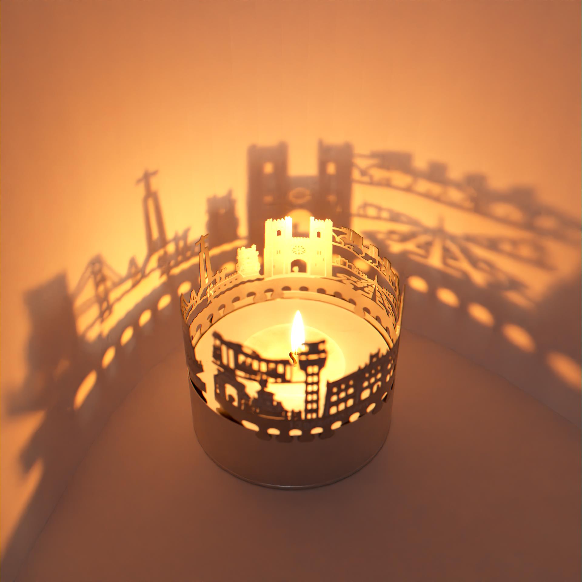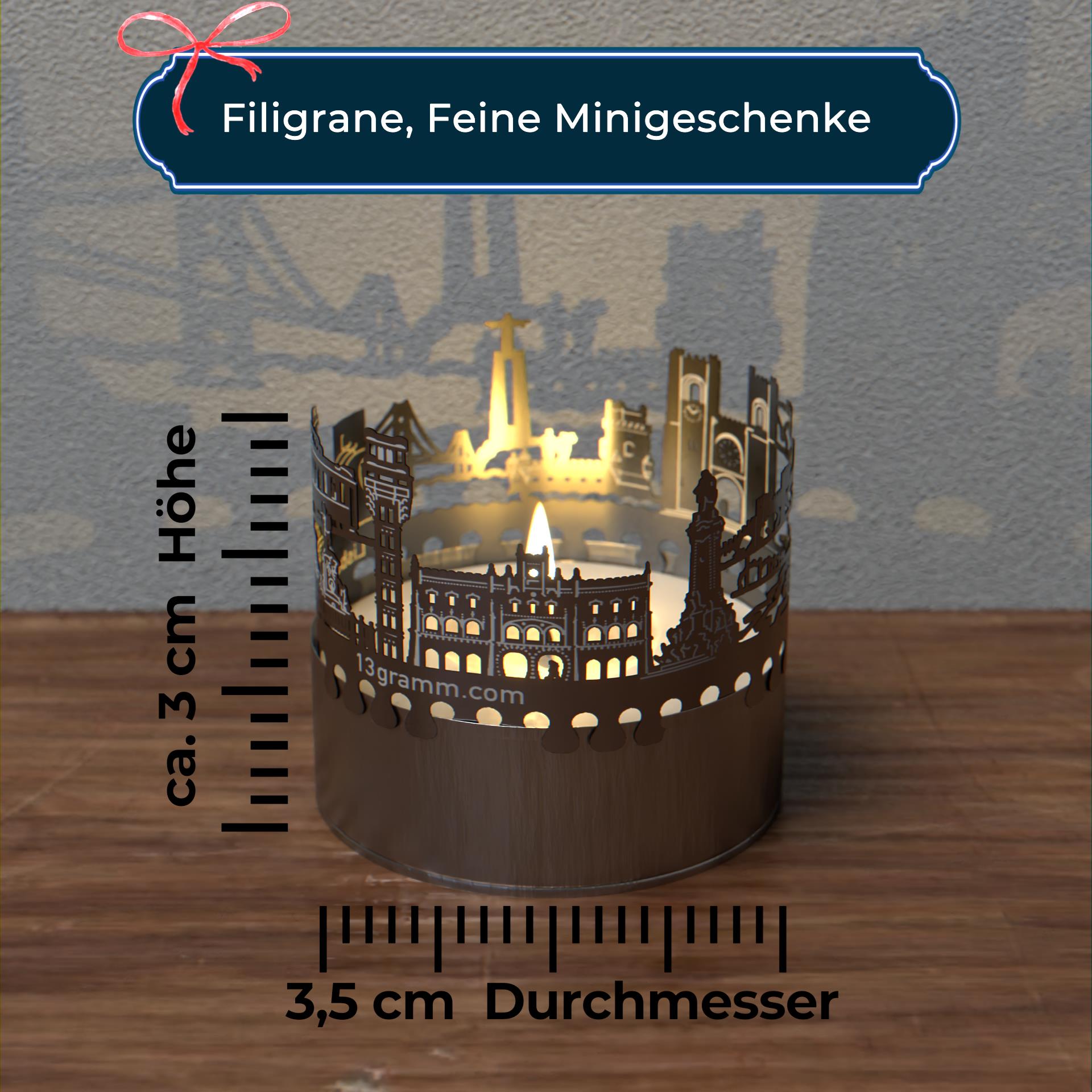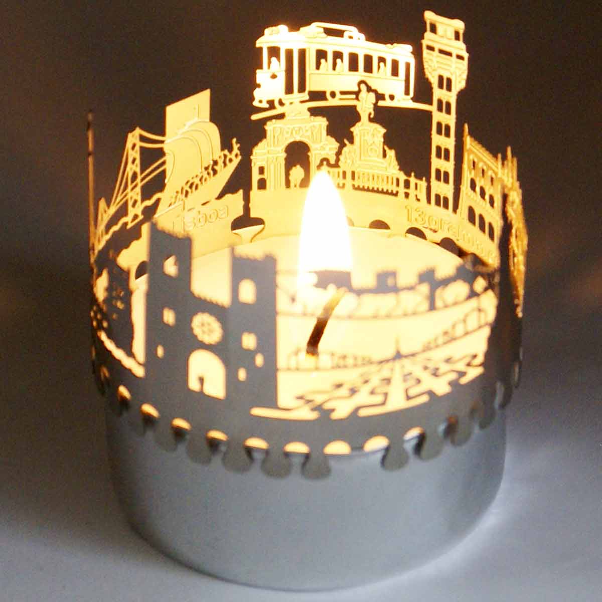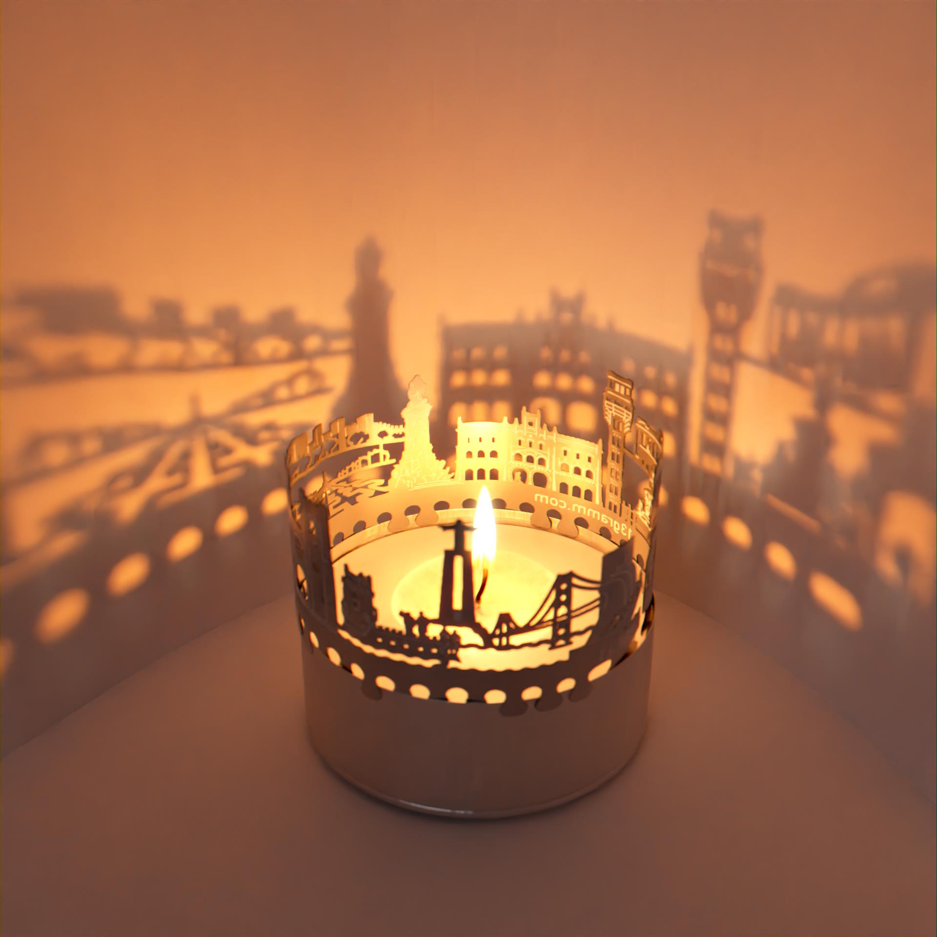Erlebe den Charme und die Schönheit der Lissabon Skyline jetzt auch bei dir Zuhause. Das Lissabon Skyline Schattenspiel ist ein einzigartiges Accessoire für jeden Fan der portugiesischen Hauptstadt. Der Kerzen-Aufsatz verwandelt jedes Teelicht in ein atemberaubendes Licht-Spektakel. Die Edelstahl-Silhouette der Lissabon Skyline zaubert wunderschöne Schattenbilder in den Raum und lässt die Sehenswürdigkeiten der Stadt zum Leben erwachen. Mit dem Flackern der Kerze entsteht eine gemütliche und entspannende Atmosphäre.