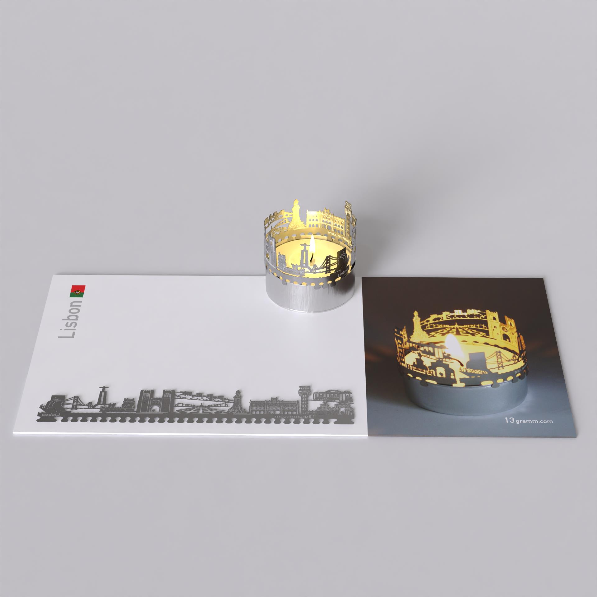 Lieferumfang: Hochwertige Lissabon Edelstahl-Silhouette, geliefert auf Träger-Postkarte im DIN-Lang Format (21x10cm). Die Silhouette passt auf alle handelsüblichen Teelichter, ist unbegrenzt wiederverwendbar und kompatibel zu allen anderen 13gramm-Silhouetten Produkten. Alle Produktteile sind in der EU gefertigt und zusammengebaut unter Verwendung von Recycling-Materialien und in Kooperation mit sozialen Einrichtungen.