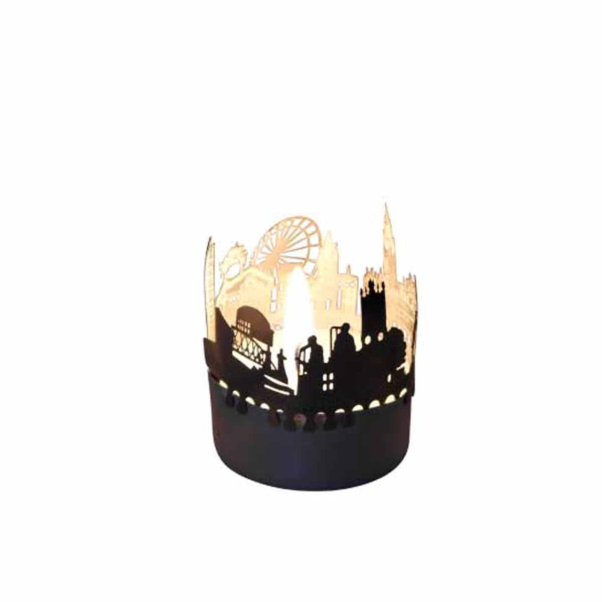 Das Manchester Skyline Schattenspiel ist das perfekte Souvenir und Geschenk für jeden Fan der Stadt. Durch den Kerzen-Aufsatz wird ein simples Teelicht zu einem faszinierenden Lichterlebnis transformiert. Die Edelstahl-Silhouette der Manchester Skyline projiziert die Stadt in den Raum und durch das flackernde Kerzenlicht wird die Skyline lebendig. Einfach magisch! Wir haben die bekanntesten Wahrzeichen, wie das Old Trafford Stadion und die Beetham Tower, für Sie in Szene gesetzt. Ein wunderbares Wohn-Accessoire, das jeden Manchester-Liebhaber verzaubern wird.