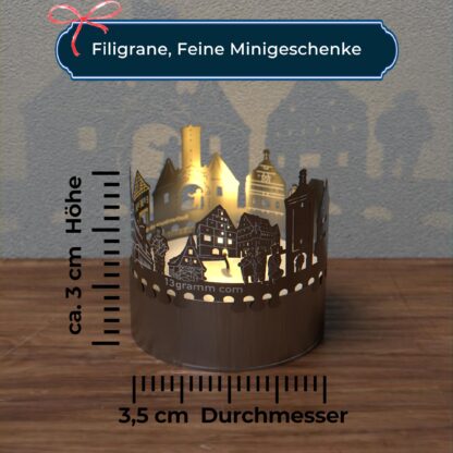 Das Rothenburg op der Tauber Skyline Schattenspiel ist ein besonderes Souvenir, das die Schönheit der Stadt auf einzigartige Weise präsentiert. Mit den Kerzenaufsätzen verwandeln sich einfache Teelichter in magische Lichtspiele, die die Sehenswürdigkeiten und Motive von Rothenburg op der Tauber zum Leben erwecken. Die Edelstahl-Silhouette der Stadt projiziert die prächtige Altstadt, die Stadtmauer und andere ikonische Bauwerke in den Raum. Ein wahrhaft beeindruckender Anblick!