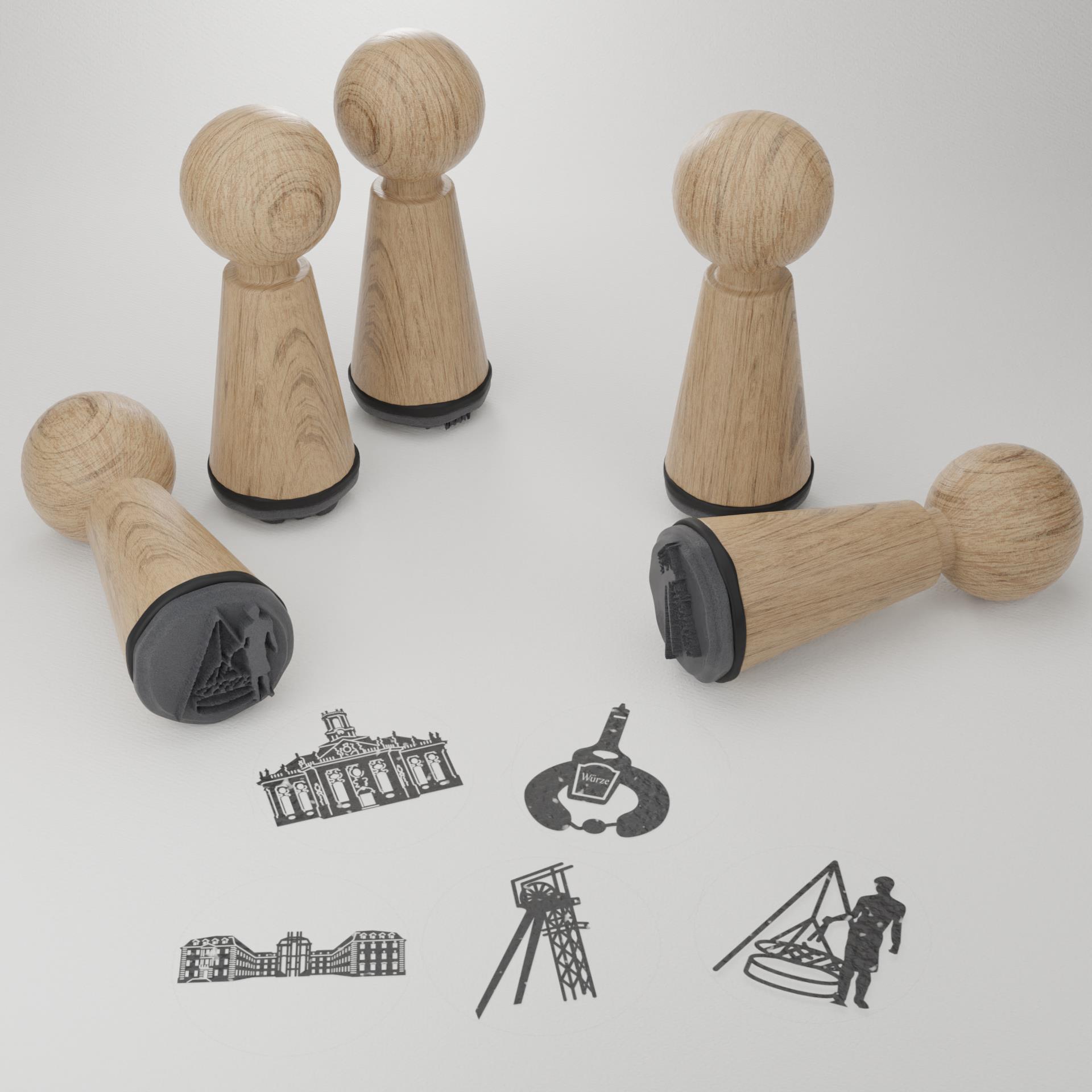Lieferumfang: Stempelset, bestehend aus 5 verschiedenen Stempeln zum Thema Saarbrücken. Die Stempel sind aus hochwertigem Buchenholz gefertigt mit einer Höhe von 36mm und einem Durchmesser von 15mm. Das Stempelgummi ist auf einer federnden Schaumstoffschicht montiert.