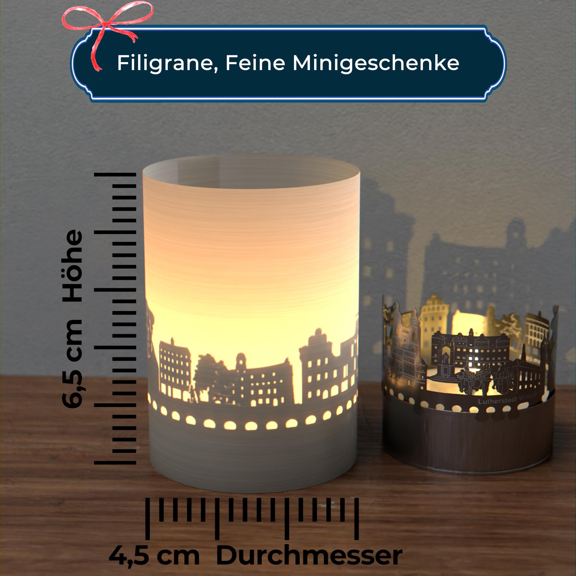 Die Wittenberg Geschenke-Tube ist das perfekte Accessoire für alle, die ihre Liebe zur Stadt im Kerzenlicht zeigen möchten. Die Silhouette und Skyline von Wittenberg werden auf eine einzigartige Weise projiziert, die Sie so noch nie gesehen haben. Durch das Flackern der Kerze wird das Schattenspiel zum Leben erweckt und die bekanntesten Sehenswürdigkeiten der Stadt wie Stadtkirche und Schlosskirche, alles in Miniatur und mit viel Liebe zum Detail gestaltet, lassen sich bewundern. Besonders schön zur Geltung kommt dies mit unserem mitgelieferten Projektionsschirm.